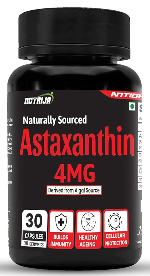 NutriJa Astaxanthin 4mg Capsules offer a naturally sourced astaxanthin supplement derived from premium Non-GMO Haematococcus Pluvialis microalgae, making it one of the Top 5 Best Astaxanthin Supplements in India for daily use.