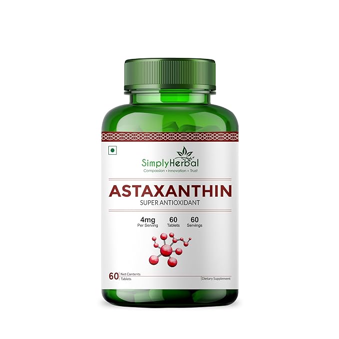 Simply Herbal Astaxanthin 4mg is a powerful antioxidant supplement crafted to support skin health, vision, immunity, muscle strength, and heart function. Known for being 10x stronger than beta-carotene and exceptionally effective at combating free radical damage, this supplement is perfect for modern lifestyle needs.