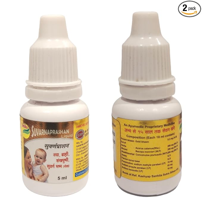 These drops are rich in Ayurvedic benefits such as improved stamina, sharper intellect, better digestion, glowing skin, and allergy control. Children who consume Suvarnaprashan regularly tend to show enhanced memory, stronger immunity, improved appetite, and better absorption of nutrients.