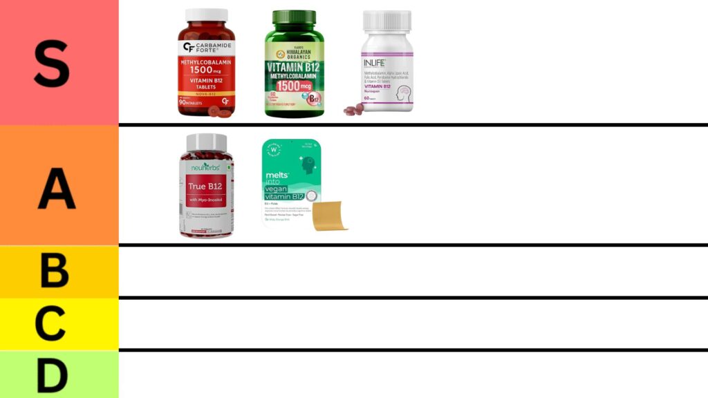 👉 Products like Wellbeing Nutrition Melts and Neuherbs Plant-Based B12 are vegan-friendly; others may be vegetarian.